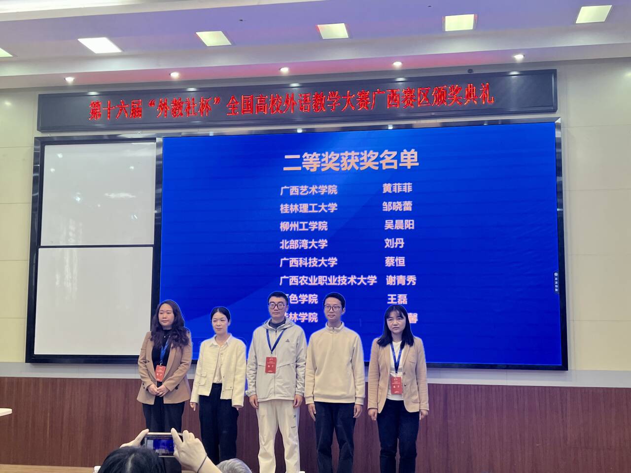 2025年11月9日,第十六届“外教社杯”全国高校外语教学大赛(广西区赛)在广西师范大学落下帷幕。经过两天的激烈角逐,外国语学院张杰老师荣获大学英语综合课组二等奖,蔡恒老师摘得大学英语视听说课组二等奖。