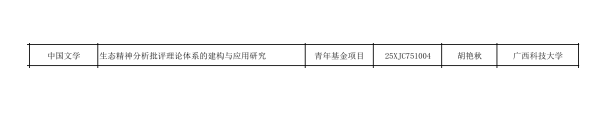 2025年11月29日,教育部社会科学司正式公布2025年度教育部人文社会科学研究西部和边疆地区项目立项名单。广西科技大学外国语学院汉语国际教育专业教师胡艳秋申报的《生态精神分析批评理论体系的建构与应用研究》获批青年基金项目。