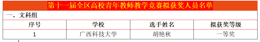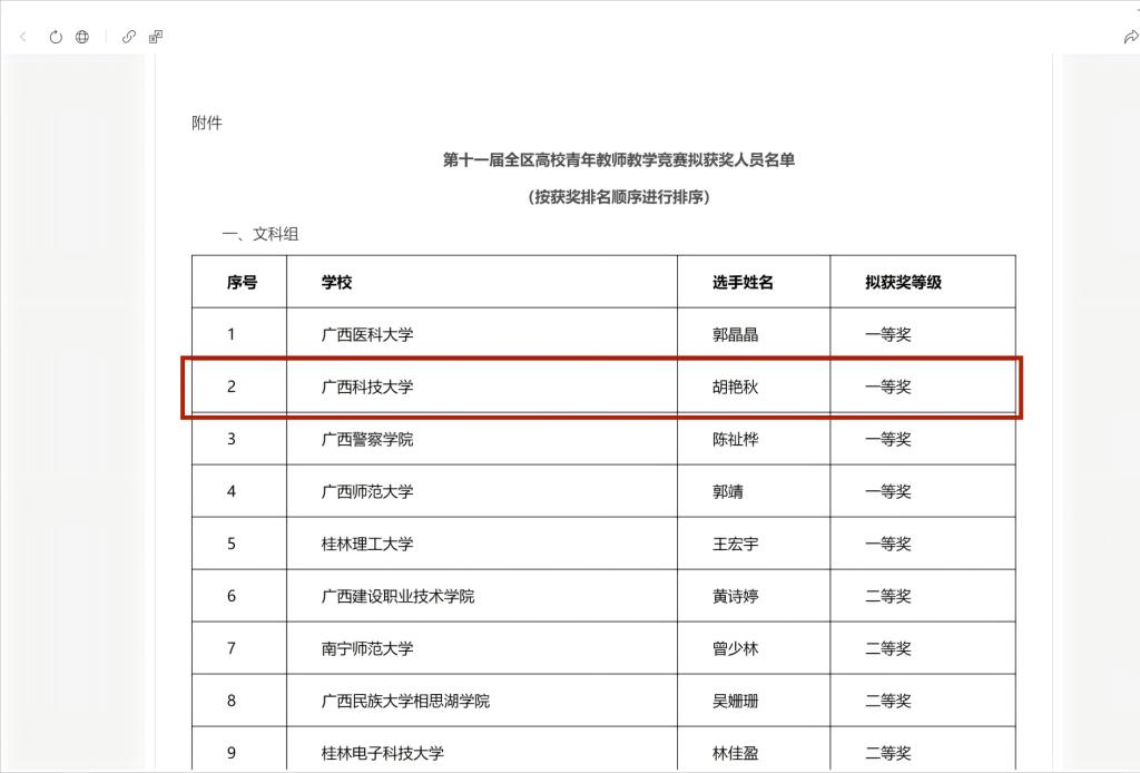 2025年12月16日广西壮族自治区教育厅公示了《第十一届全区高校青年教师教学竞赛拟获奖人员名单》。外国语学院汉语国际教育专业教师胡艳秋博士历经校赛选拔、区级初赛层层比拼,成功晋级区级决赛,最终在区级决赛的激烈角逐中脱颖而出,凭借《外国文学》这门课程获得文科组一等奖。