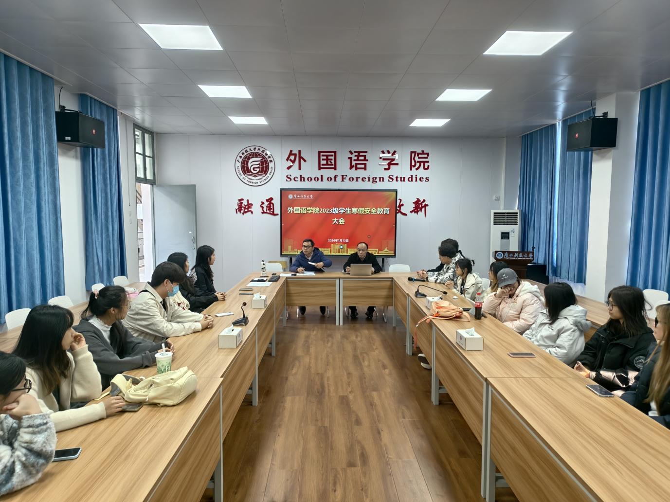 1 月 13 日下午,外国语学院按照学校《关于做好 2025—2026 学年第一学期期末和寒假期间学生管理工作的通知》要求,在 2 教 202 会议室分时段召开 2023 级期末安全教育会议。学院党委书记李辉、党委副书记黄大志及 2023 级全体同学分批次参会,会议由黄大志主持。