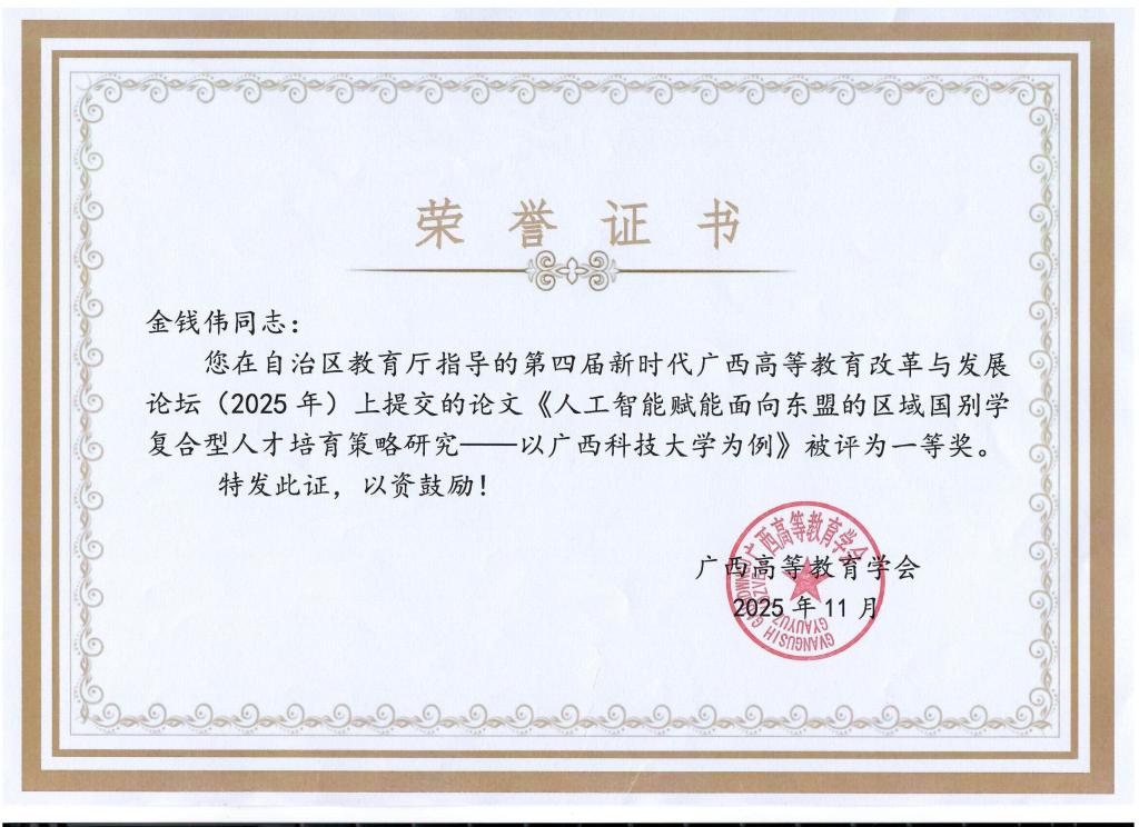 近日,第四届新时代广西高等教育改革与发展学术论坛暨《高教论坛》创刊 40 周年大会在玉林师范学院顺利举办。此次活动由广西壮族自治区教育厅指导、广西高等教育学会主办、玉林师范学院承办。会上举行了新时代广西高等教育改革与发展论坛(2025年)征文比赛颁奖仪式,外国语学院副院长金钱伟提交的论文《人工智能赋能面向东盟的区域国别学复合型人才培育策略研究——以广西科技大学为例》荣获一等奖。