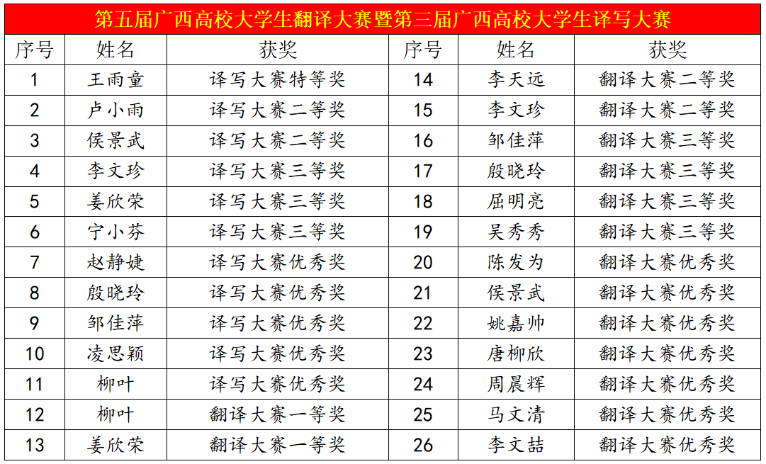 广西高校大学生翻译大赛暨第三届广西高校大学生译写大赛获奖名单