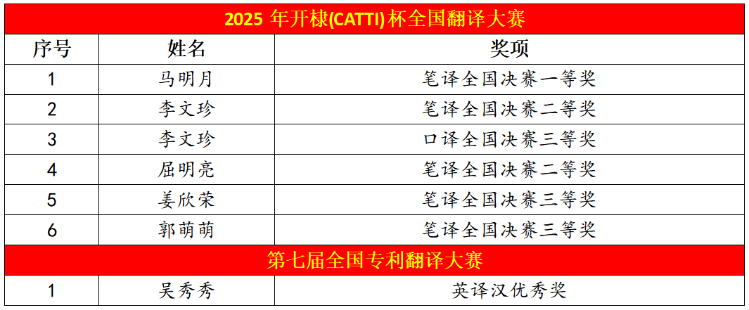 2025年开棣(CATTI)杯全国翻译大赛中,我院共有 14 名学子成功晋级决赛,其中 6 人斩获决赛三等奖及以上名次,其中马明月同学获笔译全国决赛一等奖。第七届全国专利翻译大赛中,2025级翻译硕士吴秀秀凭借出色的英译汉能力荣获优秀奖。