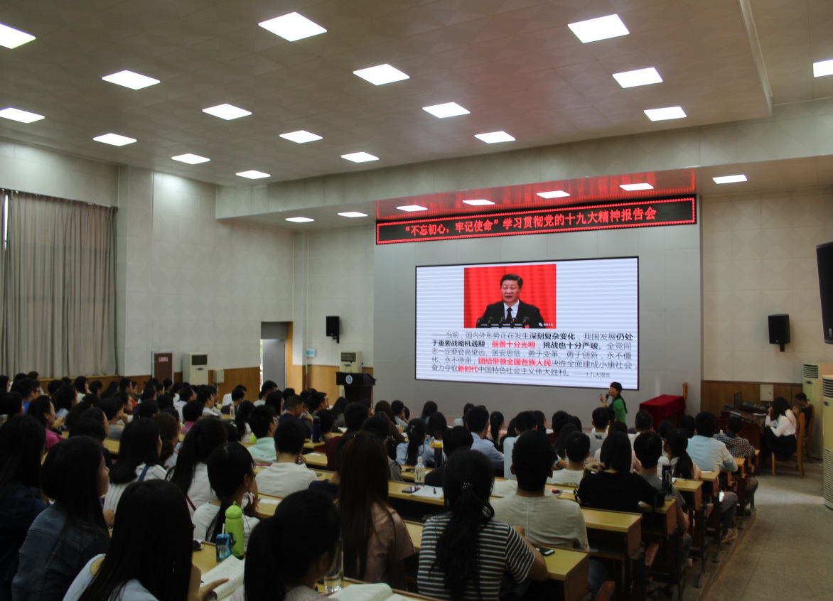 10月29日下午,学院党委联合生化学院党委邀请中共柳州市委党校韦利如副教授作了题为《不忘初心、牢记使命,学习贯彻党的十九大精神》的专题报告。报告会在图书馆报告厅举行,学院党委班子和生化学院的党委领导,以及两个学院全体教工党员、学生党员、入党积极分子等一共200多人聆听了报告。