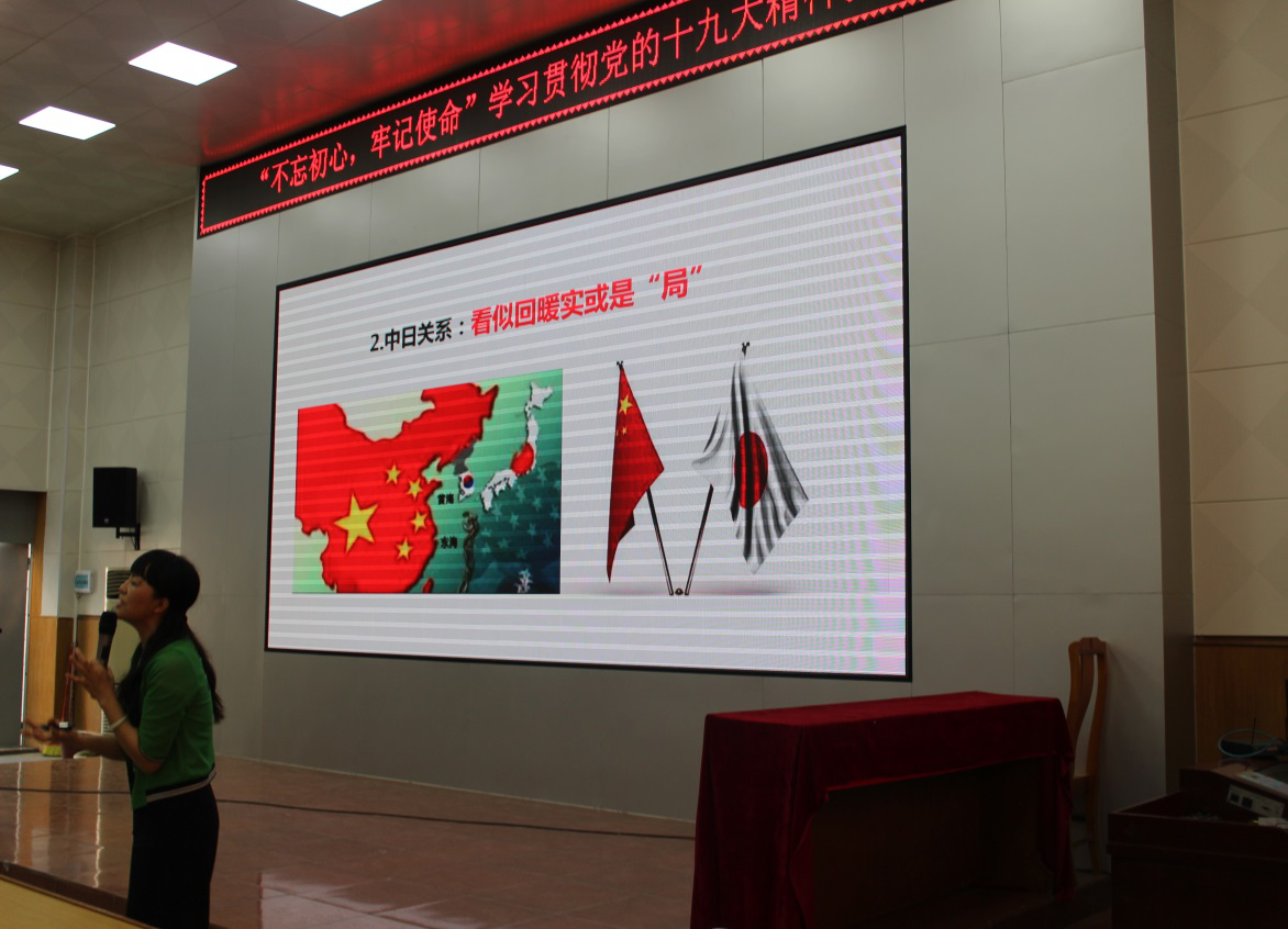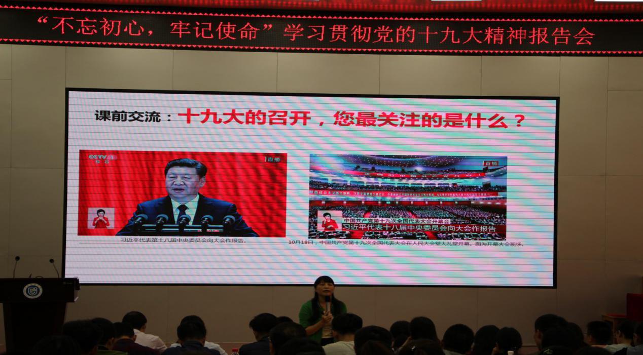 韦利如副教授长期从事马克思主义、毛泽东思想、邓小平理论、“三个代表”重要思想、科学发展观和党史党建的教学与研究工作。韦教授一开始便与在座党员互动,互动的内容是“对于十九大的召开,你所关注的是什么”。会上部分学生党员以及教师发表了自己的看法,现场探讨的氛围浓厚。报告中,韦教授从国际国内形势,党的十九大精神的解读以及青年党员如何践行党的十九大精神3个方面,以专家视角对习近平总书记代表十八届中央委员会所作的报告进行了深刻解读。