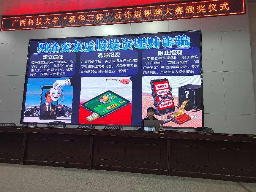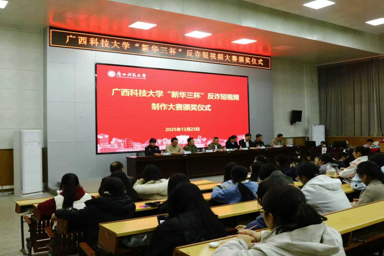 12月23日,广西科技大学“新华三杯”反诈短视频制作大赛颁奖仪式在该校图书馆报告厅举行。武装部(保卫处)、学工部(处)、研工部(院)相关负责人,赞助企业代表,柳州市公安局潭中派出所、柳东派出所民警,参赛学院(部)教师代表及获奖学生参加仪式。