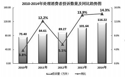 国家工商总局发布的数据显示,2014年,全国工商和市场监管部门共受理消费者投诉116.22万件,同比增长14.3%,投诉量及增幅均居五