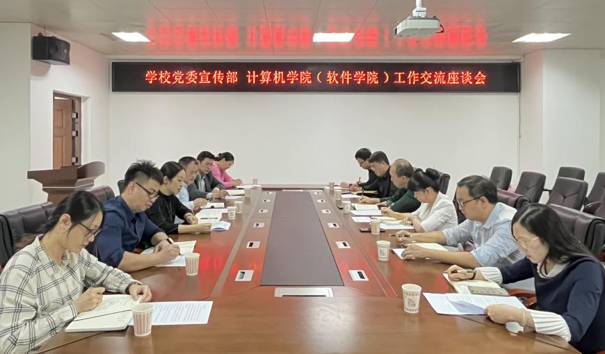 10月19日下午,学校党委常委、宣传部部长、教师工作部部长蔡亮率部门全体干部到计算机学院(软件学院)调研交流,双方在科教大楼北407会议室举行座谈会。计算机学院(软件学院)党委书记刘莉莉、院长罗文广、党委副书记黄剑华、副院长孙自广及相关负责人参加座谈会。