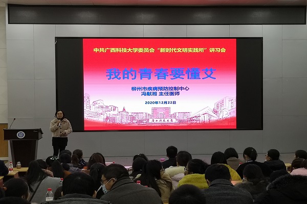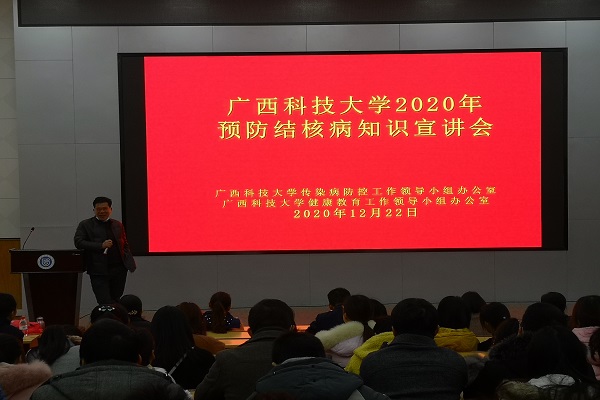 为加强我校专职辅导员对结核病、艾滋病防控知识的了解和掌握,12月22日上午,学工处、卫生所在图书馆报告厅举办广西科技大学2020年预防结核病、艾滋病知识宣讲会,宣讲会邀请柳州市疾病预防控制中心结核病防制所黄宝杨所长和艾滋病防制所冯献湘所长分别做报告,宣讲会由卫生所所长蒙天松主持,学工处全体人员、全校专职辅导员参加会议。