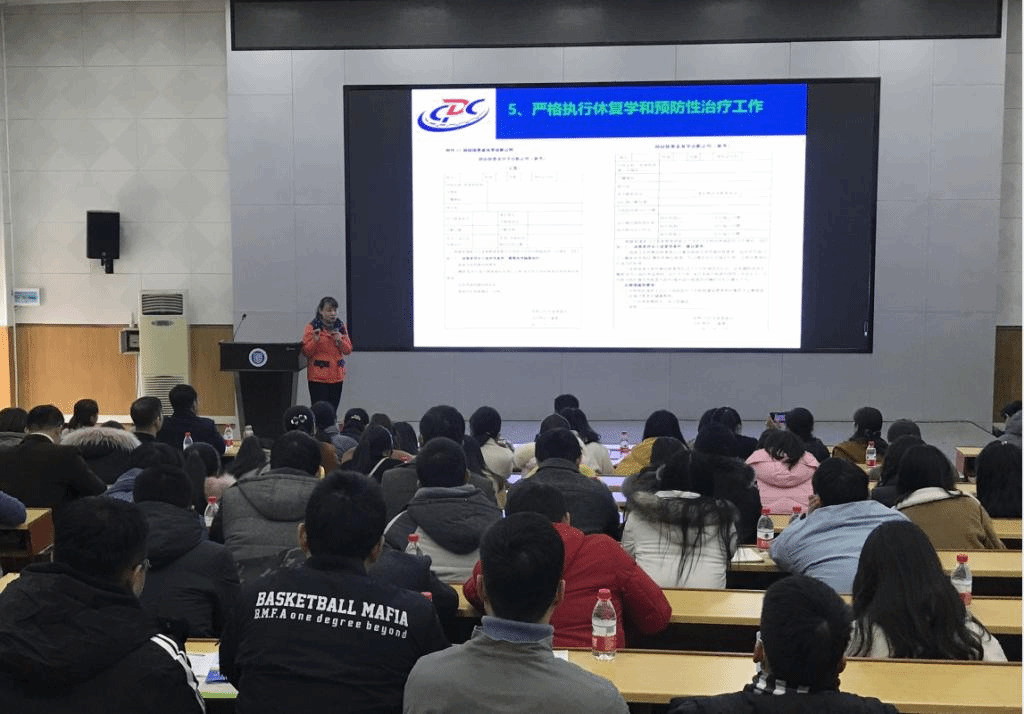 首先,黄宝杨所长对结核病概念、传播途径、学校结核病疫情特点、结核病防治等内容进行详细的讲解。黄所长强调,教师在日常工作中发现肺结核可疑症状或被诊断为肺结核的师生,主动向学校报告,不隐瞒病情、不带病上课;同时通过保持室内空气流通、加强学生体育锻炼和培养良好生活习惯等途径进行预防。