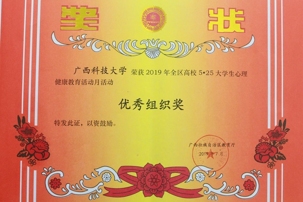 今年我校再次荣获全区高校5·25大学生心理健康教育活动月活动“优秀组织奖”,这己是近5年来我校第三次获此殊荣。今后,我校将秉承“服务学生,促进学生全面健康成长”的教育理论,继续夯实基础,加强学校大学生心理健康教育中心的“示范”建设,深入挖掘开展大学生心理健康教育的有效载体和方法,大力推进学校大学生心理危机预警信息化平台的建设,让信息化为“健康心理”赋能,提升学校心理健康教育工作实效,并形成一定工作特色,力争在全区高校中发挥示范引领作用。