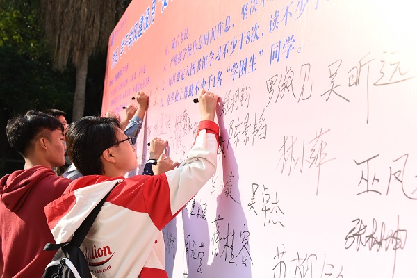 启动仪式后,同学们纷纷来到图书馆门口参加学风建设活动月“促学风、我承诺”集体签名活动,表达了要用自己的实际行动积极参与学校学风建设活动、做优良学风践行者的决心。