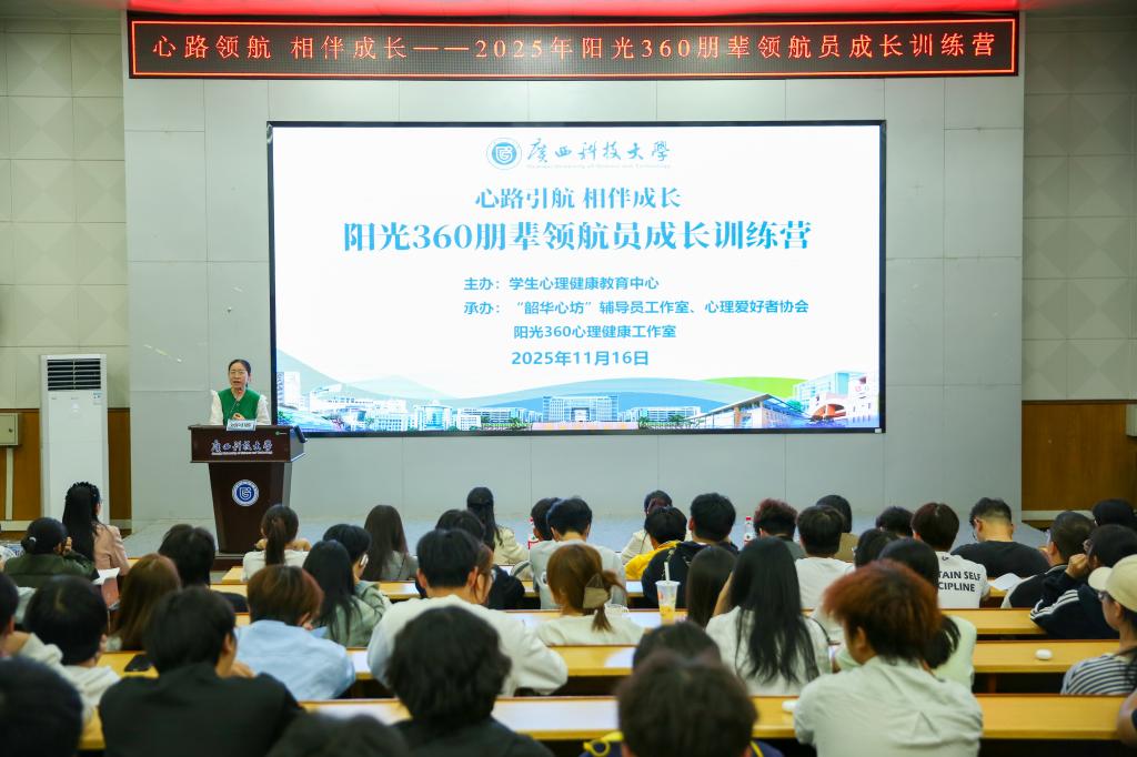 11月16日至18日,学校在文昌、柳石、柳东校区举办“心路引航 相伴成长”2025年阳光360朋辈领航员成长训练营。活动由学生心理健康教育中心主办,“韶华心坊”辅导员工作室、心理爱好者协会、阳光360心理健康工作室承办,大一、大二两百余名心理委员参加培训。学生工作部(处)副部(处)长、学生心理健康教育中心主任刘阿娜参加并致辞。