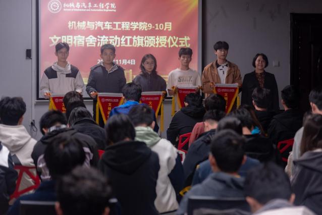 本次活动特邀广西科技大学大学生“年度人物”、国家奖学金获得者—机械专研2023级1班李润泽同学进行分享,他向与会同学们提出成长建议,强调目标定位、团队协作与学科竞赛的重要性,并通过现场。现场通过问答互动深化交流。唐艳红老师作总结发言,并对9-10月文明宿舍进行表彰,学院13间宿舍获颁流动红旗。