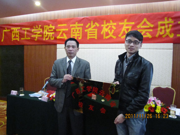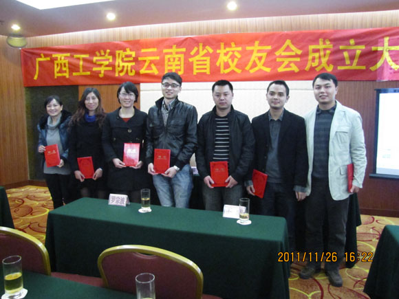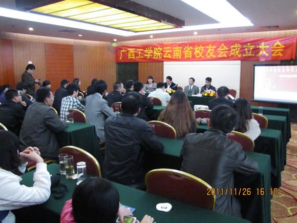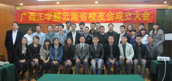 随着第26个校友会--广东省江门市校友会的顺利成立,广西工学院第27个校友会--云南省校友会成立大会于2011年11月26日在昆明市隆重举行。 出席这次会议的人员有:广西工学院党委副书记、纪委书记、校友总会常务副会长黎平;广西工学院校友总会秘书长、校友会办公室主任王先强;广西工学院工会副 主席陈芳;校友总会专职秘书甘泉老师等。