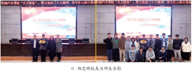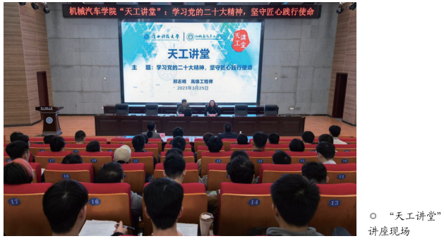 3月25日下午,中国共产党第二十次全国代表 大会代表、广西汽车集团有限公司首席技能专家、 国家级技能大师工作室负责人、2022年“大国工匠 年度人物”、广西科技大学优秀校友郑志明高级工程师做客学校机械 与汽车工程学院“天工讲堂”,在柳东校区多 功能报告厅为师生带来了题为“学习党的二十大精 神坚守匠心践行使命”的精彩讲座。机械与汽车工 程学院400多人参加了讲座。讲座由机械与汽车工 程学院党委书记卢丽虹主持。
