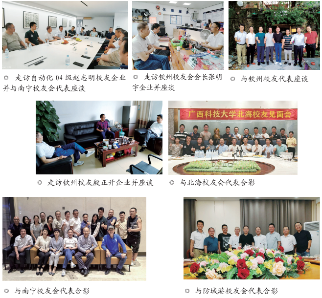 为凝聚校友力量,倾听校友声音。10月24 日-29日,学校校友 (总)会名誉会长黎平、校友办主任沈剑、副主任洪进进一行赴钦州、防城港、北海、南宁等地,走访了校友及校友企业,与地方校友会校友代表深入交流,与北海市校友会商议换届事宜,广泛征求了校友们的意见及建议。