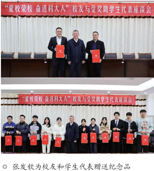 张发钦代表学校对在百忙之中抽出时间参加学校建校65 周年系列庆祝活动的校友表示热烈欢迎,对校友们一直以来对学校建设的关心和支持表示衷心的感谢。他指出,召开座谈会不仅可以增进校友与学校之间、校友与老师之间、校友与学弟学妹之间的感情,而且可以让在校学生通过与校友面对面地交流,更好地认识社会,得到更多学习、就业、创业的机会。他强调,学校的发展离不开校友、老师和同学们的支持和参与,在学校改革发展攻坚期,所有广西科大人更要树牢命运共同体意识,秉承“求真近道、明德致新”的校训,践行“敢为人先、百折不挠,务实创新、追求卓越”的广西科大精神,勇担使命,砥砺奋斗,真正做到爱校荣校,以实际行动支持、推动学校事业发展。张发钦还为校友和参会学生代表赠送了纪念品。