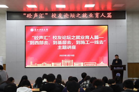 3月10日下午,土建学院在文昌校区图书馆报告厅开展“砼声汇”第二期校友论坛之“到西部去、到基层去,到施工一线去”主题讲座。学院党委副书记、院长邓宇,党委副书记、纪委书记谭璐,十一冶建设集团有限责任公司第三分公司总经理李松联(1999级校友)、人力资源部部长刘喆及2025届200余名毕业生参加了会议,会议由邓宇主持。