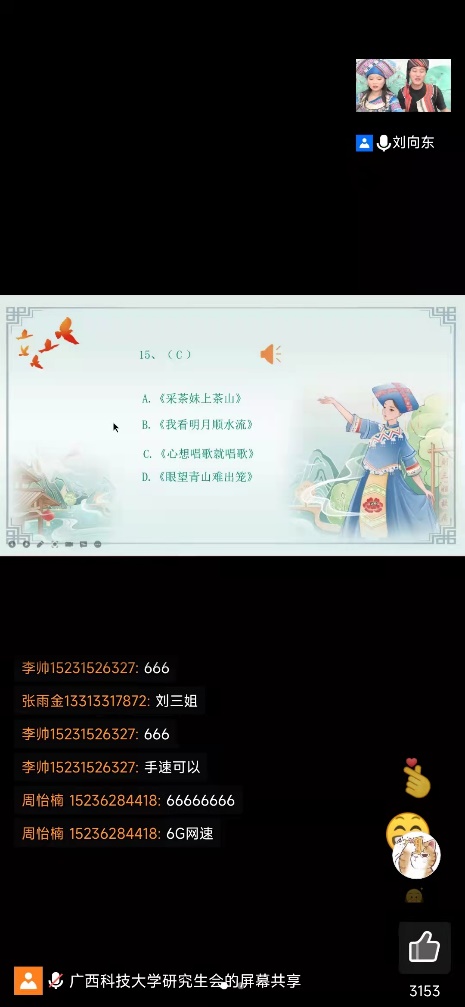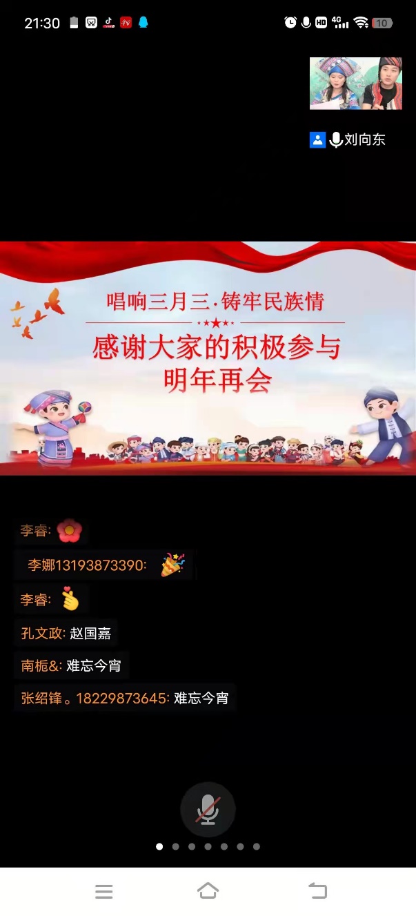 4月3日晚7:30,身穿壮族靓丽服饰的两名主持人在腾讯会议直播间笑意盈盈地向大家打招呼,活动正式开始。活动分为5个环节:猜山歌、民俗问答、山歌对唱、嘉宾连麦、山歌合唱。主持人以良好的主持功底以及幽默的话语,牢牢把控全场气氛,把大家的情绪很快地调动起来。每个环节都有很多同学积极参与,尤其是在抢答环节中,充分体现了大家对山歌和民族文化的熟悉程度。活动期间,同学们积极点赞,还有同学唱出优美的山歌,大家通过弹幕积极回应。中场休息时间,主持人还介绍了五色糯米饭、青团等节日传统食品。经过几轮的答题,大家的分数从胶着到明朗,最终有6名同学胜出,获得奖品。最后,在山歌大合唱中,活动圆满结束了。