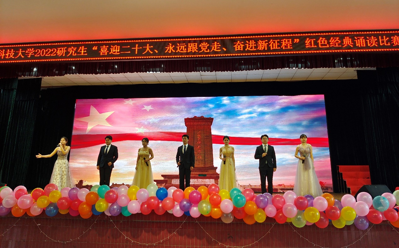 来自各学院的17个参赛团队着装整齐,精神抖擞,激情澎湃。诵读作品内容丰富,有革命诗文、经典诗歌、还有革命故事。除了关注诵读技巧外,团队们还精心设计表演形式,配上视频和背景音乐、情景剧等。整场比赛节奏紧凑而有序,现场气氛热烈,赵国嘉团队以一首《英雄》起了个好头,一开场就吸引了大家的注意力;刘向东团队深情地向两弹元勋邓稼先致敬;彭玥婷团队重现了中国⼈民的声音第一次通过无线电波传到了全国各地那段历史等。各个团队都以自己的方式表达了心中的敬意,喷薄而出的情感更使得观众们产生了强烈的共鸣。最终,来自马克思主义学院的刘向东团队夺得桂冠。人文艺术与设计学院的胡艳秋老师代表评委们对参赛团队的表演技巧、情感表达等进行了专业点评。