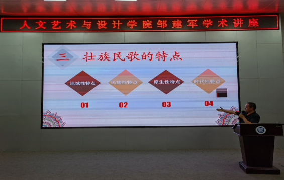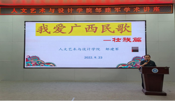 9月23日晚19点,人文艺术学院音乐专业硕士生导师邹建军副教授在文昌校区图书馆学术报告厅成功举办“我爱广西民歌——壮族篇”研究生学术讲座。本次音乐研究生学术活动得到了学院吴振国副院长、金钱伟副院长、杨明莉主任等领导的大力支持。音乐系全体在读研究生、本科生和音乐系吕红阳教授、刘晓佳博士等师生共计200余人共同参与了此次音乐系举办的硕士生导师音乐主题学术研究系列讲座活动。