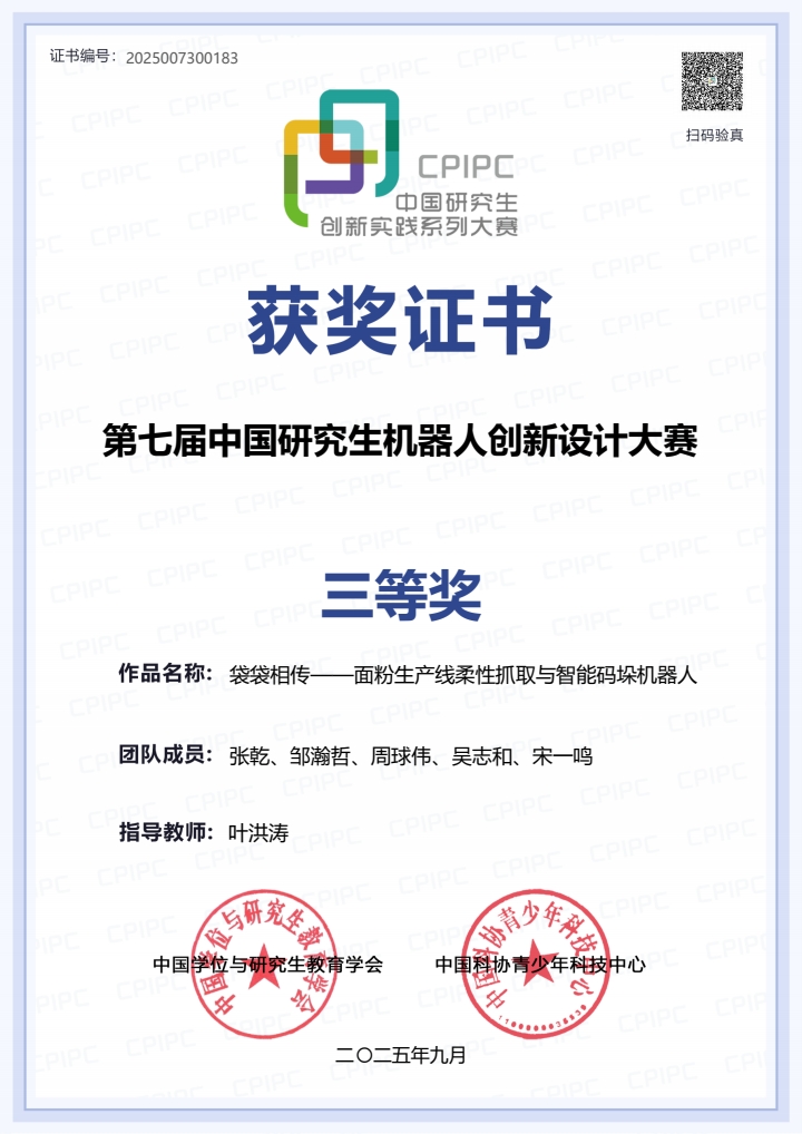 近日,第七届中国研究生机器人创新设计大赛全国总决赛在山东济南落下帷幕。经过激烈角逐,由我校自动化学院导师叶洪涛指导,自动化学院研究生张乾、邹瀚哲、周球伟、吴志和、宋一鸣共同完成的作品《袋袋相传——面粉生产线柔性抓取与智能码垛机器人》荣获全国三等奖,这是我校首次在中国研究生机器人创新设计大赛获得奖项,实现该项赛事的历史性突破。