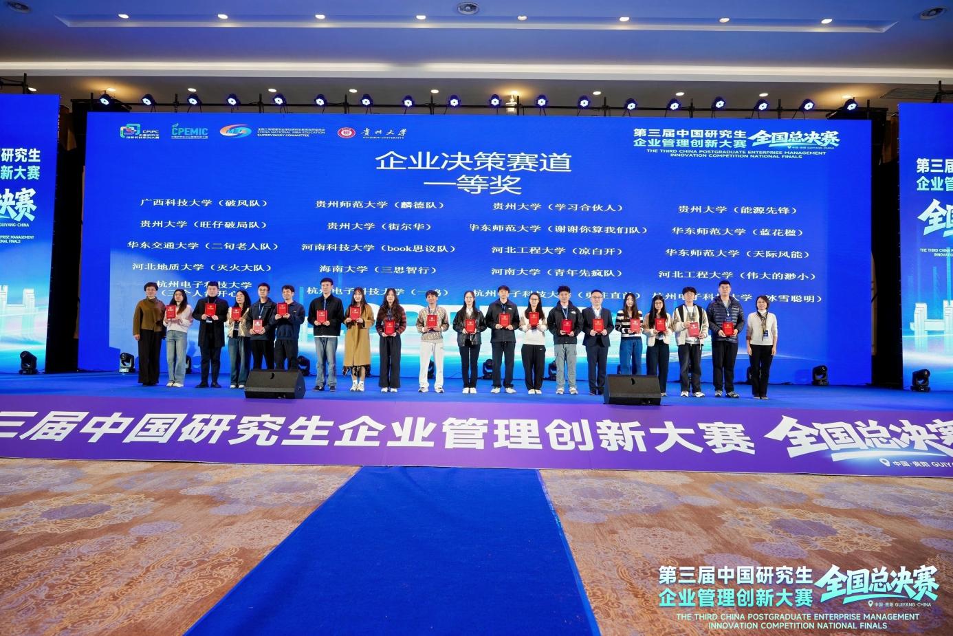 2025年11月8-9日,第三届中国研究生企业管理创新大赛全国总决赛在贵阳落下帷幕。经过初赛、复赛和现场决赛等层层角逐,由我校经济与管理学院导师廖志高指导,经济与管理学院研究生白卓颖、陈紫微、凡雨组成的“破风队”凭借出色表现,斩获企业决策赛道一等奖,实现了我校在该项赛事上的新突破。