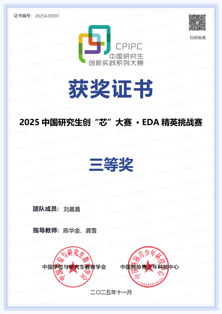 11月30日,2025中国研究生创“芯”大赛·EDA精英挑战赛决赛在香港落下帷幕。经初赛选拔、决赛现场答辩和路演,我校电子工程学院2025级研究生刘晨晨(指导教师陈华金、龚雪)凭借优异表现,荣获全国总决赛三等奖,实现了我校在该项赛事上的新突破。