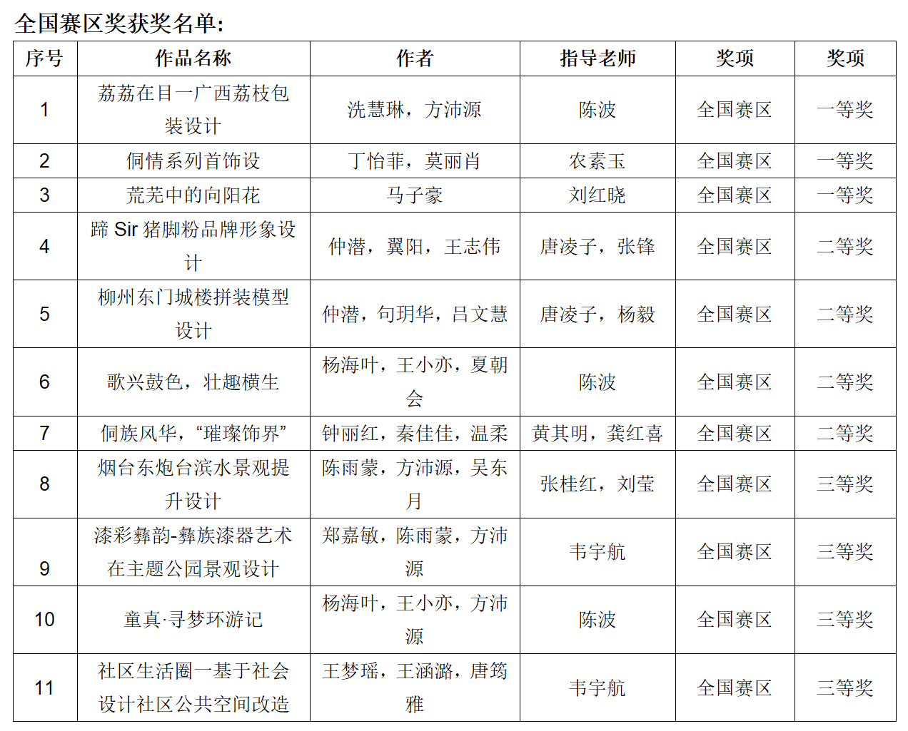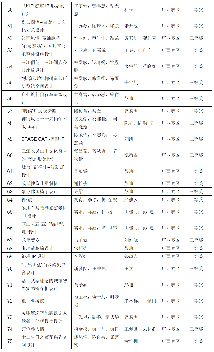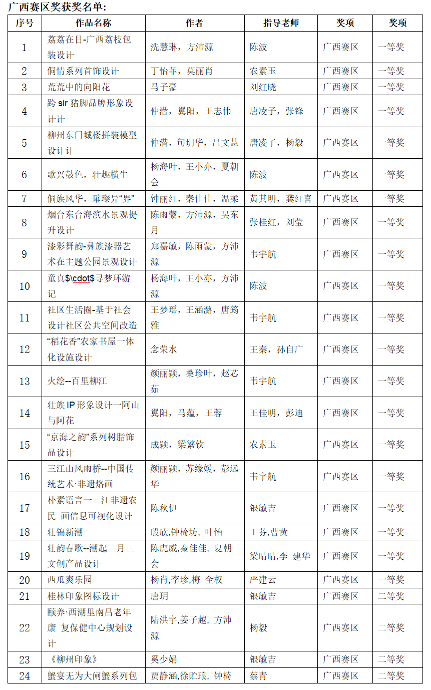 在今年举行的未来设计师·全国高校数字艺术设计大赛中,我院学生荣获全国赛区奖项11项,其中一等奖3项,二等奖4项,三等奖4项;荣获广西赛区奖项76项,其中一等奖20项、二等奖22项、三等奖34项。