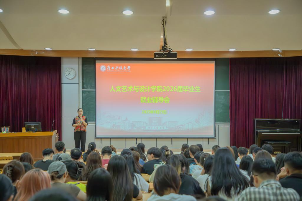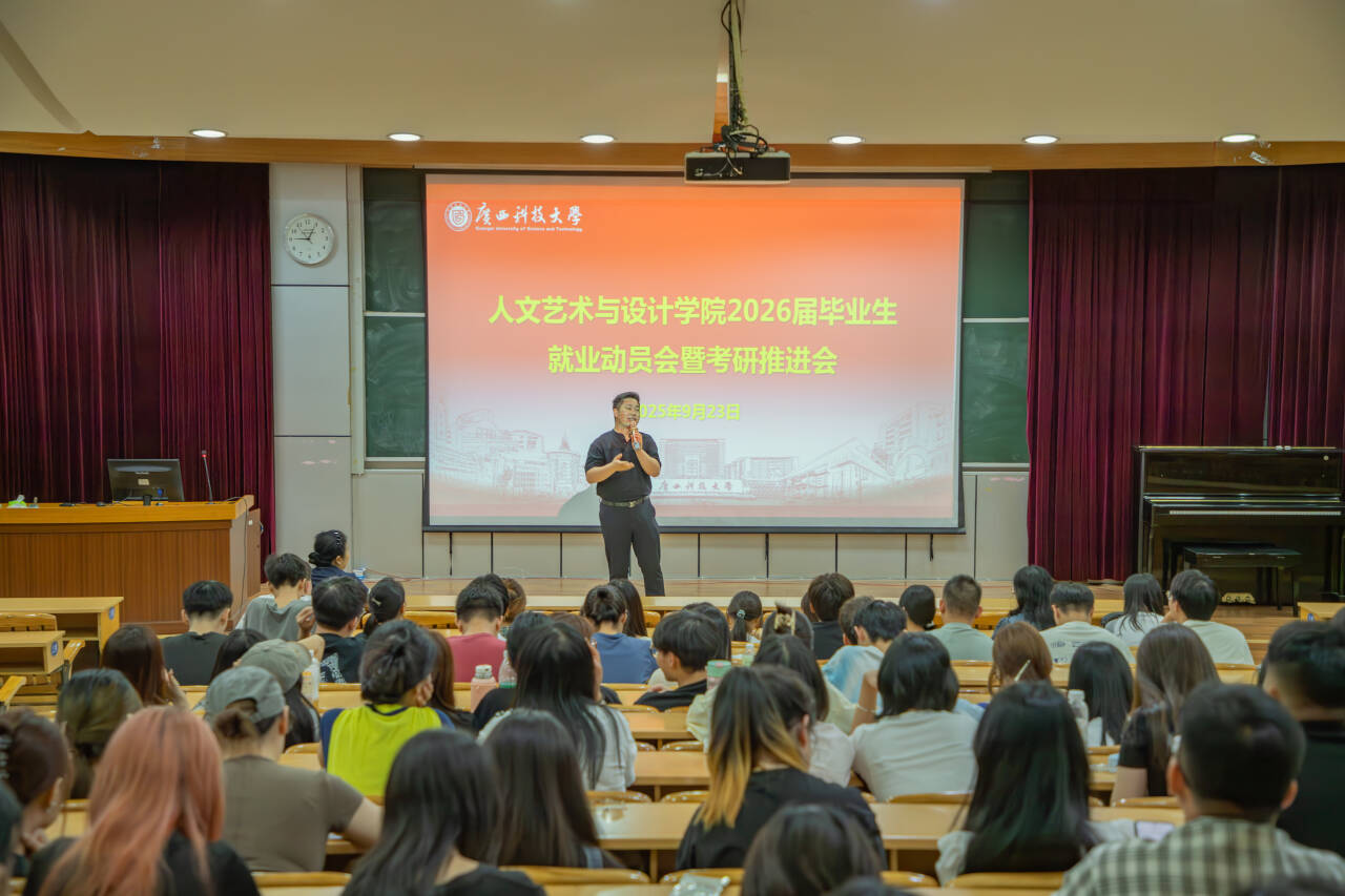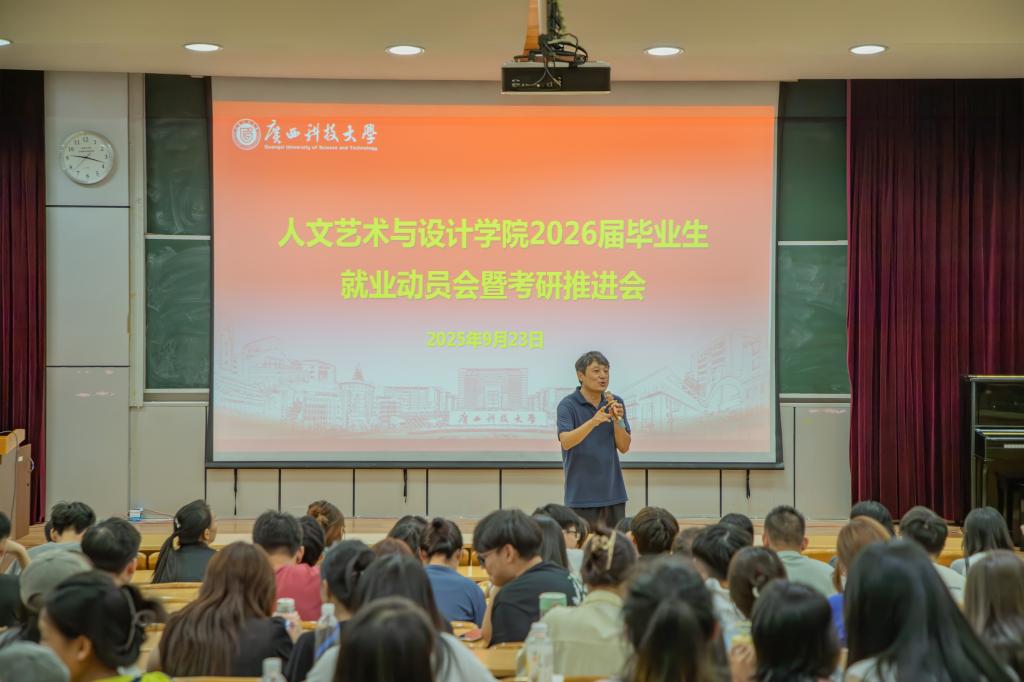 9 月 23 日晚,学院在文昌校区第四教学楼四阶五教室,召开 2026 届毕业生就业动员会暨考研推进会。学院党委书记刘莉莉,学校党委武装部副部长、保卫处副处长周武汉和我院优秀校友广西柳州南庭艺筑装饰工程设计有限公司总经理周聪辉出席会议,学院就业专干、2026 届全体本硕毕业生参会。会议由学院党委副书记沙磊主持。