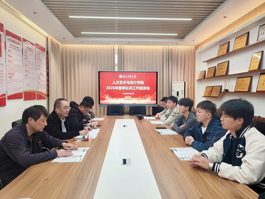 为扎实推进我院2026年春季征兵工作,精准动员毕业生投身国防事业,12月10日上午,武装部副部长、保卫处副处长周武汉,武装部军事科科长盘九保一行来我院开展春季征兵工作座谈会。学院党委副书记、纪委书记沙磊,学院征兵专干及2022级意向参军学生参会。