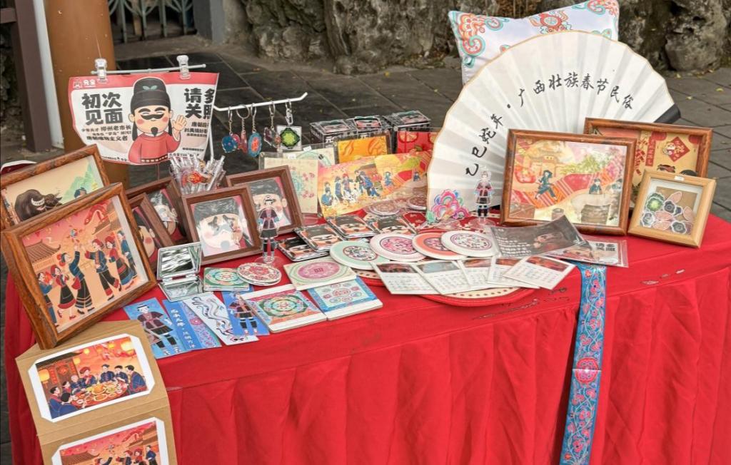 本次展览设于柳侯祠核心庭院,展出三十余件融合柳宗元文化与广西壮族民俗的文创作品,涵盖IP盲盒、民俗插画、实用文创等多种形式,将传统元素与现代设计巧妙结合,让传统文化可触可用。