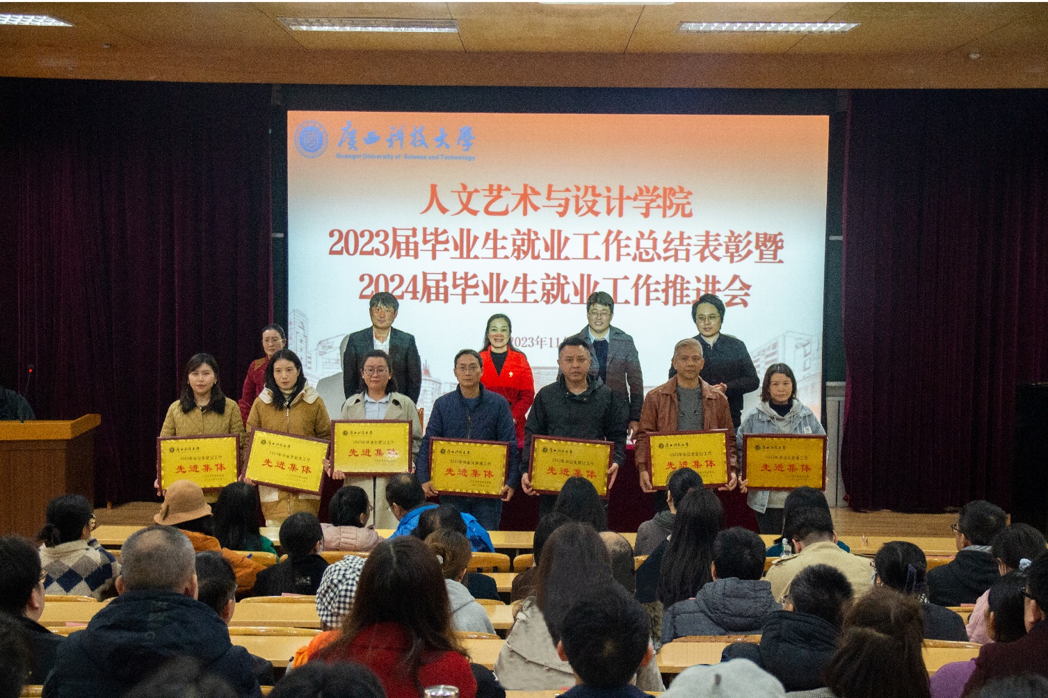 学院副院长刘红晓传达了《广西科技大学关于表彰2023年毕业生就业工作先进集体和先进个人的决定》,宣读了《人文艺术与设计学院关于表彰2023年毕业生就业工作先进集体和先进个人的决定》,与会领导为获奖先进集体和先进个人进行了颁奖。