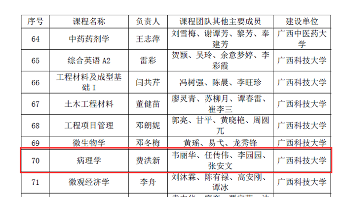 近日,广西壮族自治区教育厅发布《关于公布第三批自治区级一流本科课程名单的通知》(桂教高教〔2022〕30号),我部费洪新博士负责的《病理学》被认定为线上线下混合式一流本科课程,在医学部实现了新的突破。