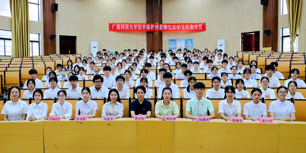 5月25日上午,医学部护理系第七次学生代表大会在柳石校区第二报告厅举行。系党总支书记覃启鲜、党总支副书记郭钰婷,系学工办主任、团总支书记韦星安以及学生代表200余人出席会议。