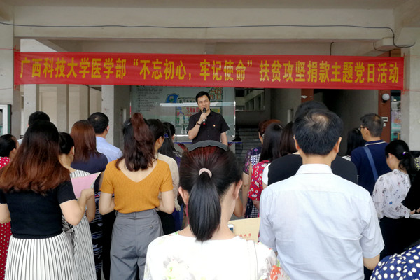 活动开始,医学部党委办公室主任梁贞巧宣读了《“不忘初心、牢记使命”脱贫攻坚捐款活动倡议书》,倡议学部全体党员同志为学部对口脱贫点——潭头乡西岸村进行脱贫捐款。学部党委常务副书记、纪委书记谭铁军讲话指出,全体党员干部要深入学习贯彻习近平总书记关于脱贫攻坚工作的重要指示精神,进一步提高政治站位,切实把思想和行动统一到习近平总书记关于脱贫攻坚工作的重要指示精神上来,进一步深化思想认识、端正政治态度,以对党对人民对历史负责的态度,保质保量地完成党和人民交付的各项脱贫攻坚任务,不断提高脱贫质量和成效,以打赢打好脱贫攻坚战的实绩来诠释对党和人民的忠诚。