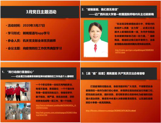 活动中,各支部充分利用线上平台的优势,结合自己支部的实际情况,开展具有本支部特色的主题党日活动。医学部机关党支部除了向“学习强国”APP上优秀典型学习外,还以我校第一附属医院呼吸内科主任梁新梅医生为代表的医护人员作为优秀典型模范,对他们义无反顾的冲击在疫情一线的行为表示敬意与赞扬,他们舍生忘死、为人民服务的精神值得我们每一个党员去认真学习。护理系学生第一、第二党支部与药学系学生党支部也充分挖掘了身边优秀典型事迹,不仅分享了我校毕业生郝铭扬参与援助湖北抗疫工作的英雄事迹,还让本支部疫情期间参与了志愿服务活动的学生党员分享了自己的感受,用身边实际的例子号召党员们向优秀人物学习,时刻铭记自己的党员身份,在疫情防控中发挥先锋模范作用,为打赢疫情阻击战贡献力量。