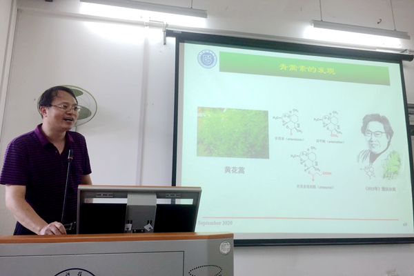 9月10日下午,药学系主任蒋旭东副教授在3501教室讲授《药物化学》课程绪论,他从桂林南药股份有限公司(原桂林制药厂)获得国家卫生部颁发的001号新药证书出发,向同学们介绍了屠呦呦等中国科学家从传统中药宝库中获得灵感,发现了抗御疟疾的青蒿素及其衍生物,树立了我国在现代医药研究中利用传统中医药宝库发现新药物的典范,为人类抗击疟疾斗争做出了重要贡献。“路边不起眼的植物也能开发出良药”,同学们在为家乡企业感到自豪的同时,深刻体会到药物化学的魅力,坚定了学好药物化学课程的信心。