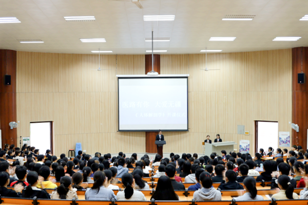 10月29日上午,基础医学部人文素养系列活动之“感恩生命,人文素质教育《人体解剖学》开课仪式”在柳石校区第二报告厅举行。此次活动由基础医学部主办,医学部团委、人体解剖学协会承办。出席本次活动的有医学部学工办主任、团委书记何曲波,基础医学部党总支书记谭海梅,柳州市红十字会代表林靖凯老师,基础医学部人体解剖学教研室部分老师及基础医学部全体党员同志。医学部临床专业约200名同学参加了此次开课仪式。