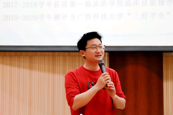 紧接着,由获得广西科技大学科技创新奖学金和创客年度人物的来自临床173班的王炼同学围绕学习与专升本、活动、科技创新等方面进行讲解。他认为,学习成绩是在校生最为重要的一部分,同学们要树立对自己、对学业的信心,积极参与到创新创业的活动中,从各方面提高自己的综合能力。王炼同学幽默风趣的讲解方式不仅易于理解,也使同学们受益匪浅。