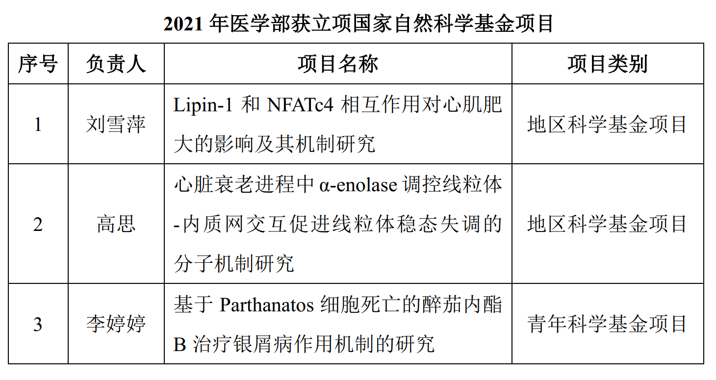 近日,国家自然科学基金委公布了2021年度集中接收申请项目评审结果。在学校、医学部及各位老师的共同努力下,医学部2021年获国家自然科学基金项目立项3项,其中地区科学基金项目2项,青年科学基金项目1项,立项数、资助经费均创新高。