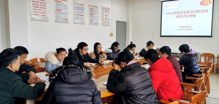 根据《关于开展2021年度基层党组织书记抓党建工作述职评议考核工作的通知》要求,护理系党总支于2021年12月28日下午组织总支委员、各党支部书记、组织员、支部委员、党员代表在柳石校区402会议室召开述职评议考核会议,对总支所辖4个支部(1个教工支部、3个学生支部)2021年度支部书记抓党建工作进行述职评议考核。