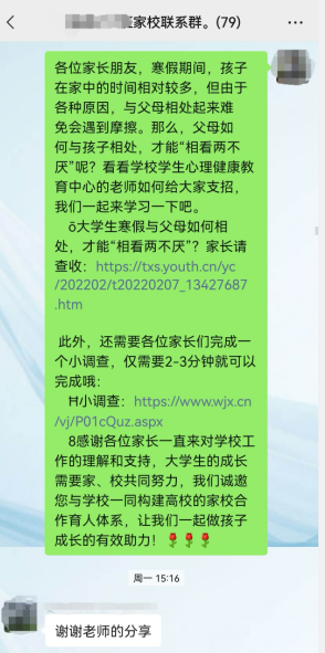 在学校心理中心的指导下,学部对8083名学生的心理状态进行了摸排,重点关注近期身在新增为中高风险区的学生及学业困难、家庭特殊的学生群体,并对有需要帮助的学生制定一对一的帮扶计划。同时,学部广泛宣传学校网络心理援助热线,并利用网络平台向学生及家长推送疫情期间心理健康知识和心理调节技巧,帮助其了解疫情中的心理应激特点以及如何积极应对当前疫情形势,形成让学生主动求助的良好氛围。