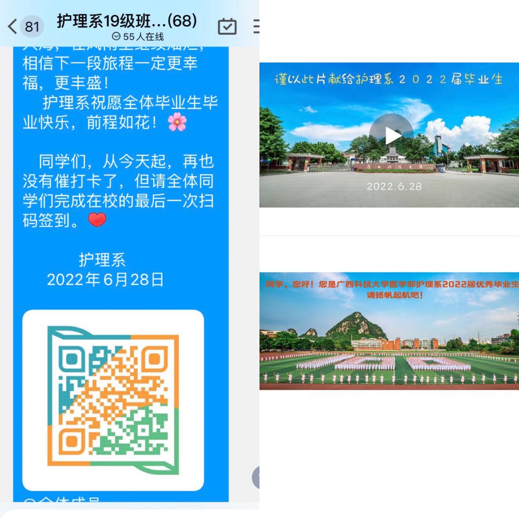 此外,护理系还为全系学生送上祝福视频,并让全体毕业生进行最后一次扫码签到。看着成功扫码后屏幕呈现出“同学,您好。您是广西科技大学医学部护理系优秀毕业生,请扬帆起航吧!”以及全体毕业生的大合影,同学们惊喜连连,感动不已。
