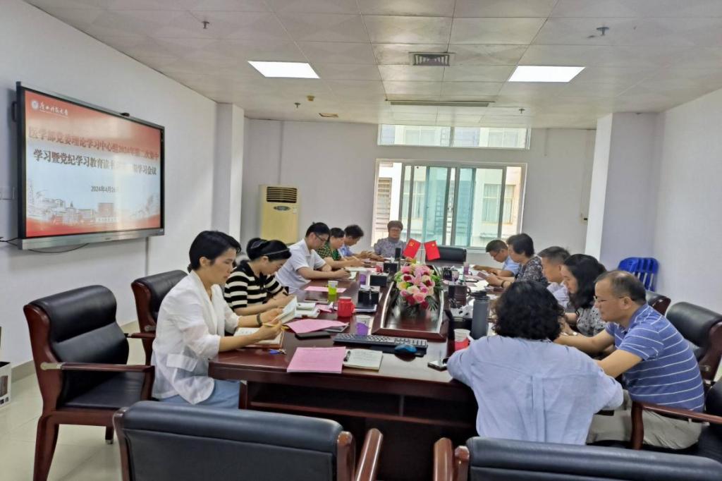 4月26日,医学部党委在柳石校区学部会议室召开理论学习中心组2024年第二次集中学习暨党纪学习教育读书班第一次学习会,医学部党委理论学习中心组成员参加,会议由医学部党委常务副书记廖奕主持。