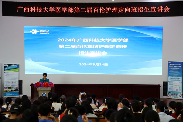 公司人力资源中心副总监郑艳介绍了公司的总体情况,包括公司的企业文化、业务领域以及未来的发展规划,并详细讲解了第二届百伦护理定向班的特色与优势。