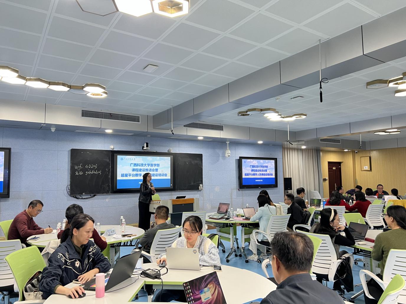 2026年3月17日下午,医学部联合超星公司,在文昌校区4D203智慧教室召开课程建设推进会暨超星平台数字人微课建设培训会。学部党委副书记、常务副主任冯学珍出席会议,副主任古旗主持会议,各教学单位负责人、自治区一流本科课程负责人及相关教师共70人参会。