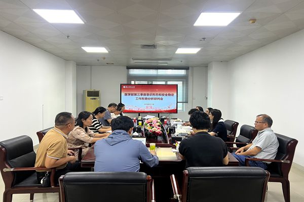9月15日下午,医学部在学部会议室召开2025年第三季度意识形态和安全稳定工作形势分析研判会,学部领导、三系一部党政领导参加会议。会议由学部党委常务副书记廖奕主持。