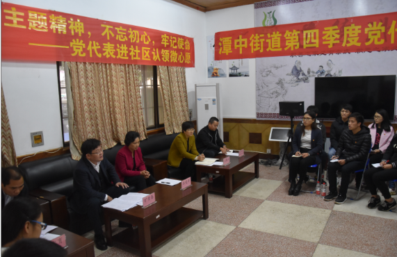 11月30日下午,潭中街道党代表工作室结合工作实际,组织驻室党代表到我校开展了以“学习十九大主题精神,不忘初心、牢记使命——党代表进社区认领微心愿”为主题的第四季度党代表接待日活动。驻室党代表市人民政府副市长、党组成员旷青春,市人大常委会原副主任苏爱群,城中区委常委、区纪委书记黄水育,我校党委组织部、职业技术教育学院领导及职业技术教育学院20余名困难学生党员参加了本次活动。活动由城中区潭中街道党工委书记钟宏珊主持。